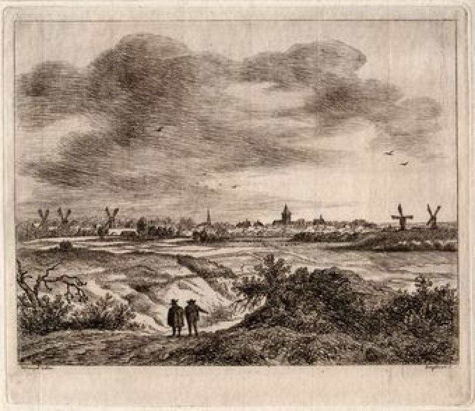 E119 Gezicht op een stad met vijf molens