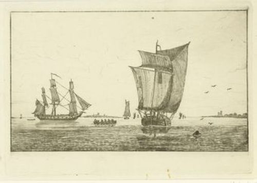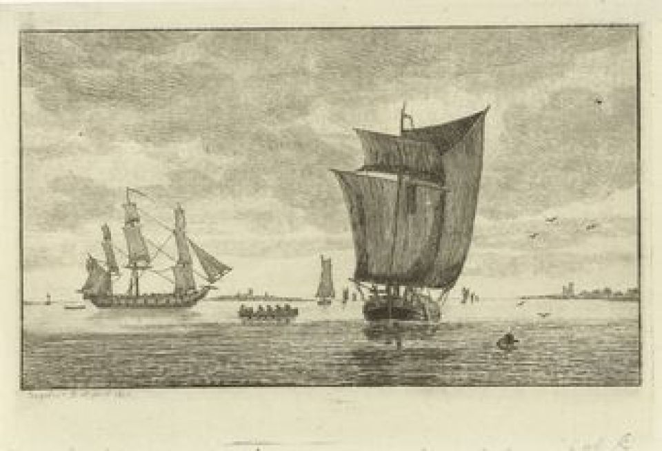 E122 Zeegezicht met zeilschip en oorlogsschip