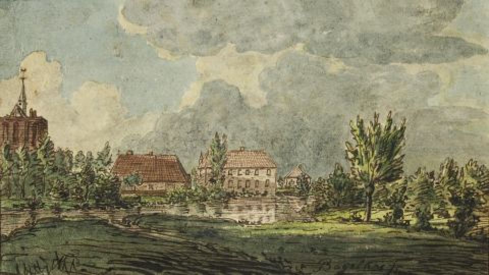 Rechtsonder in tekening: Bagelaar f; op de achterzijde: Klooster ten Haag bij Eijndhoven en katoendrukkerij capt. Bagelaar adv. fecit