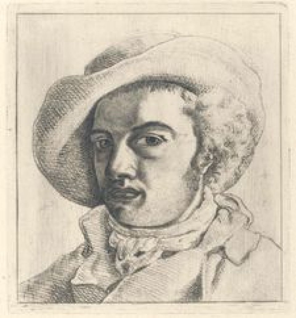 Simon Andreas Krausz (1760-1825), schilder en etser van landschappen met vee, riviergezichten en interieurs bij kaarslicht te Den Haag (Scheen). De ets is gemaakt naar het op paneel geschilderde zelfportret van Krausz, gesigneerd en gedateerd 1794.