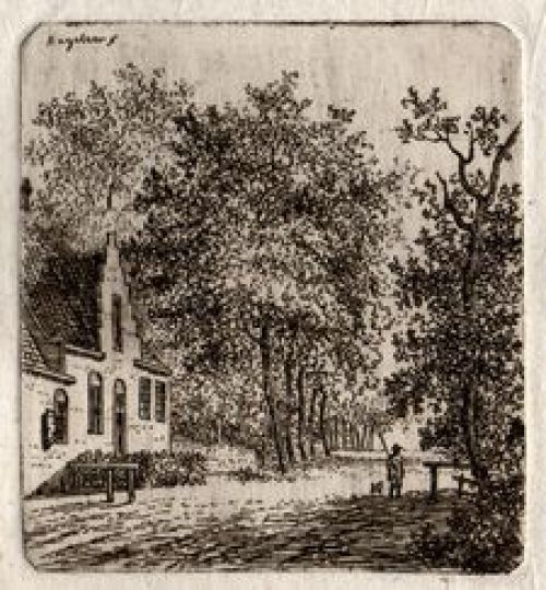 Bij een ets staat met potlood geschreven: De herberg van den boer Klugt buiten het Haagsche Bosch.