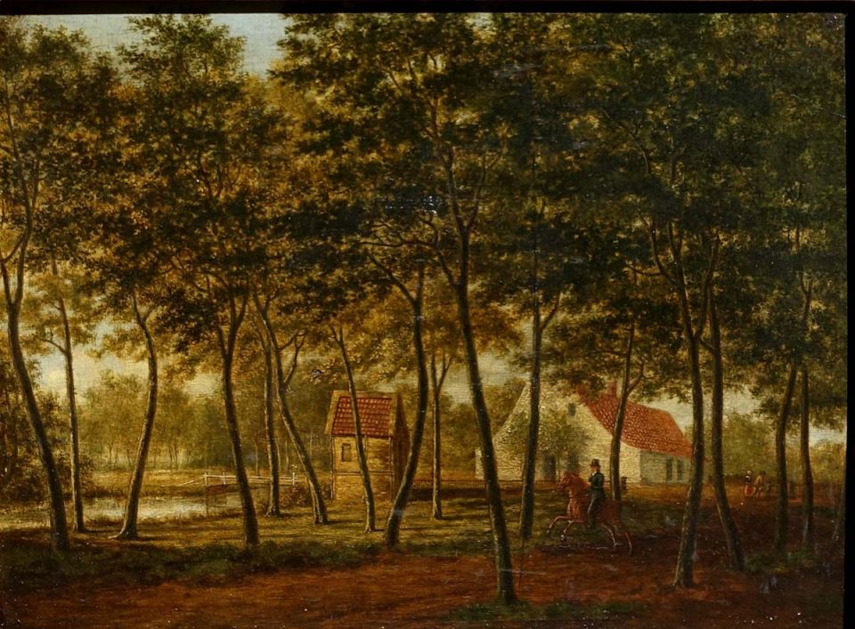 S010 Ruiter op een bospad bij kanaal en twee huizen
