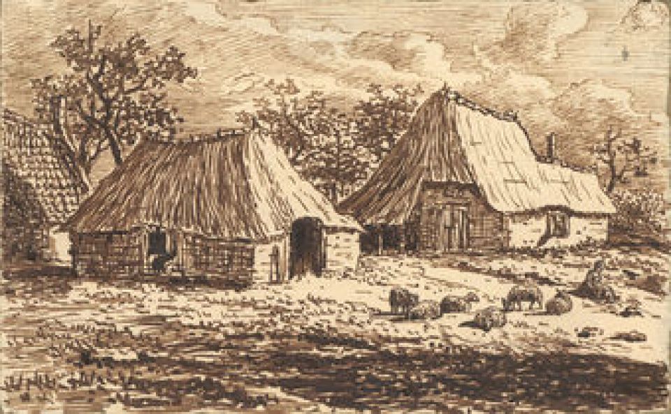T070 Zittende vrouw met zes schapen bij boerderij